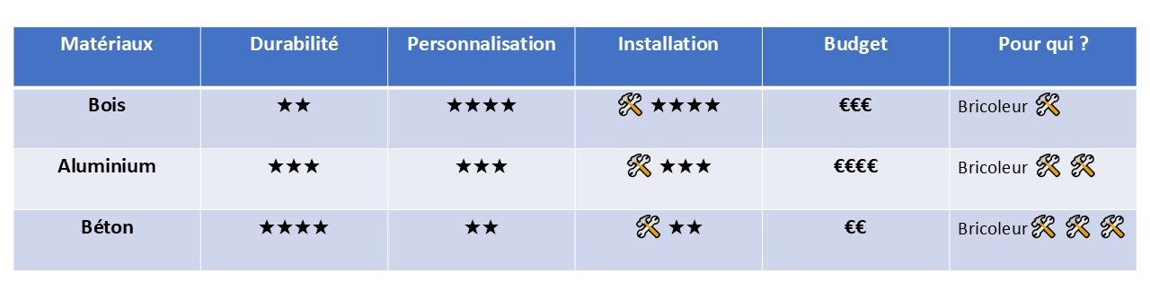 L’aluminium est à la fois léger et robuste, ce qui facilite l’installation tout en garantissant une grande stabilité de la structure.